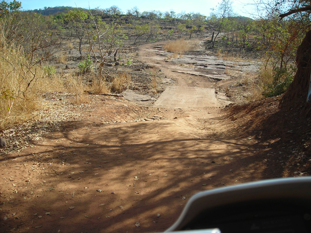 Ab Koundian führ nur noch ein schmaler Pfad durch das Grenzgebirge, über grobe Steine, Felsplatten und durch ausgewaschene Flussbetten. Noch wenige Kilometer, und wir sind am Grenzfluss Faleme, wo die Kinder nur auf uns gewartet zu haben scheinen. Fette Steine machen es unmöglich, durch die Furt zu fahren. Also wieder schieben. Alle wollen mithelfen, drängen um die Maschine, Carsten hat Mühe, in dem Tumult das Motorrad aufrecht zu halten. Unter ohrenbetäubendem Geschrei bewegt sich der kunterbunte Haufen zum anderen Ufer. Tropfnass strecken wir dem fast blinden Grenzer unsere Pässe hin.